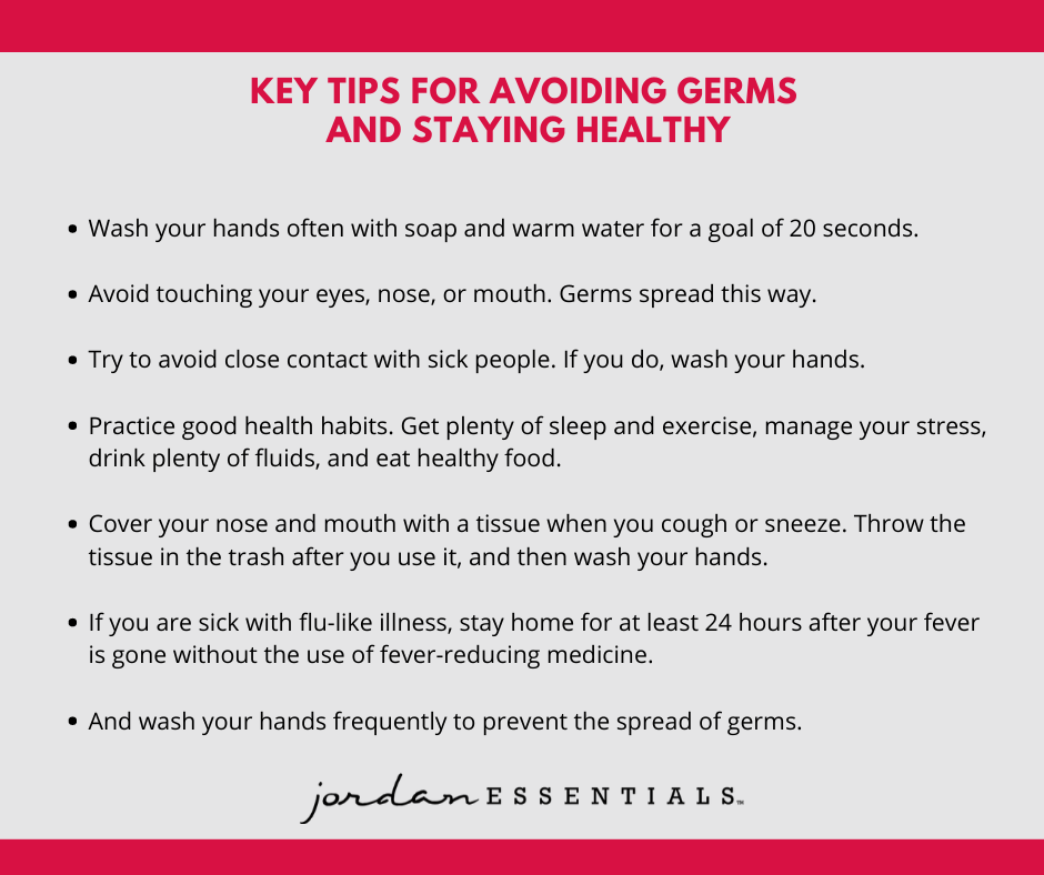 Start by placing a bottle of our foaming hand soap at each sink in your house.  Jordan Essentials Foaming Hand Soap is available in a variety of fragrances and essential oils to please everyone in your home. Try setting out a fresh bottle of hand soap in the restroom at work to promote healthy hand washing throughout the office too.